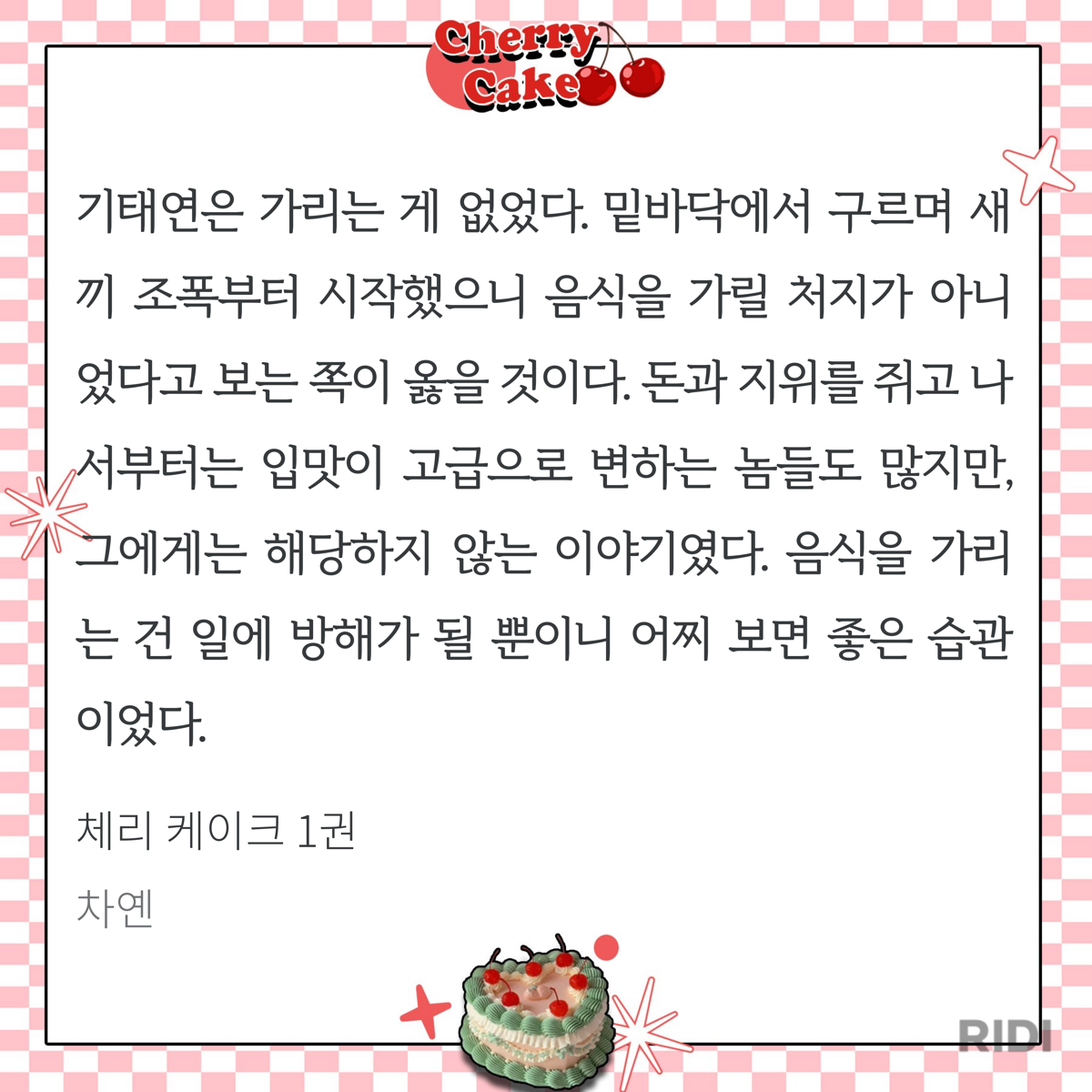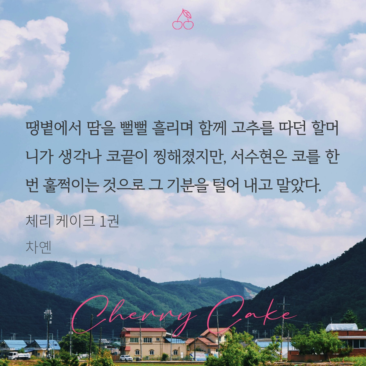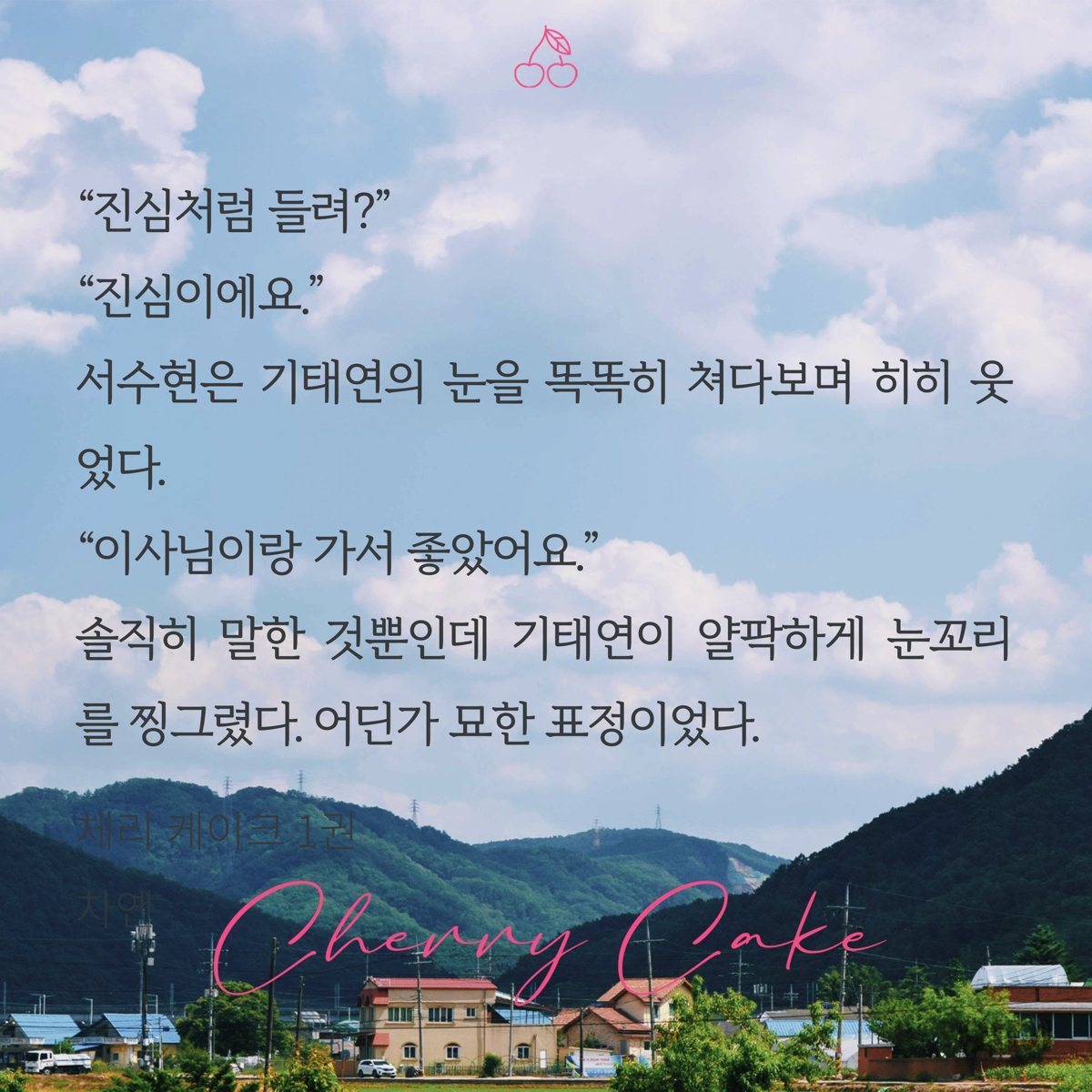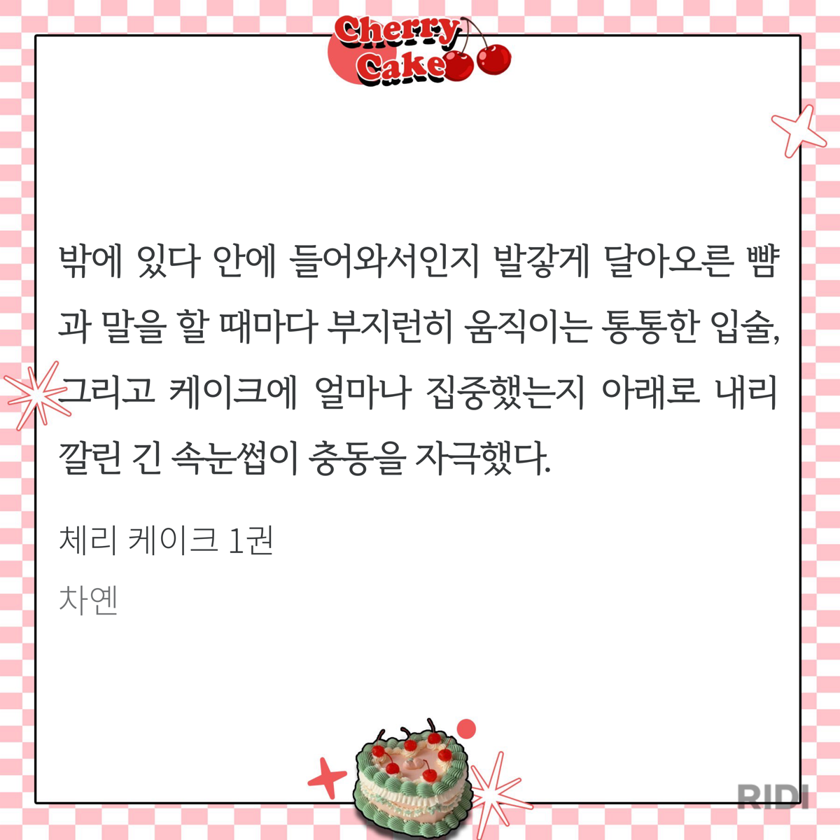 체리 케이크 조아라 연재때부터 반응이 너무 핫해서 단행본 나오면 읽어야지 존버하고 있었는데 천사덬이 1권을 나눔해줘서 운좋게 1권을 선물받아 읽어보게 됐어!🩷