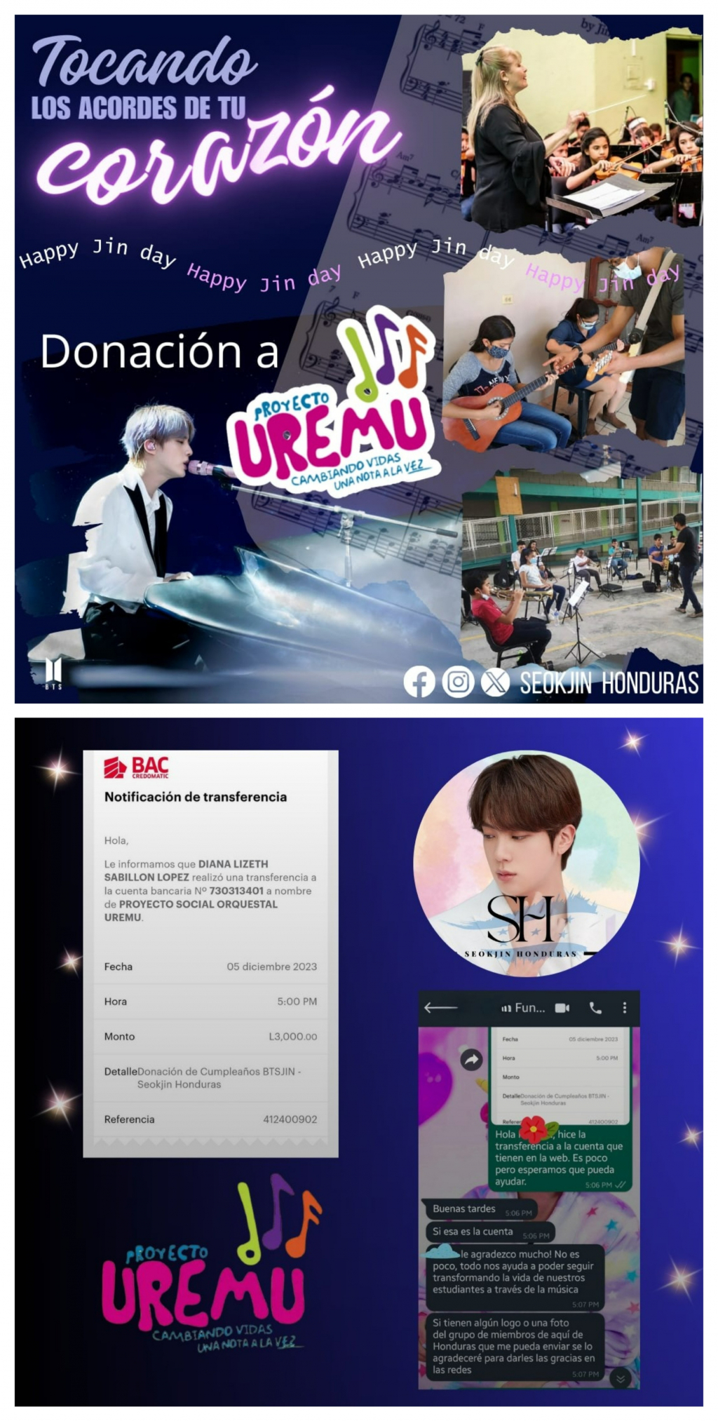 진의 온두라스 팬 베이스(@Seokjin_HN)는 "PLAYING THE CHORDS OF YOUR HEART"라는 이름의 생일 프로젝트로 음악을 통해 삶의 변화시키는 재단 'Proyecto Uremu'에 기부했다.