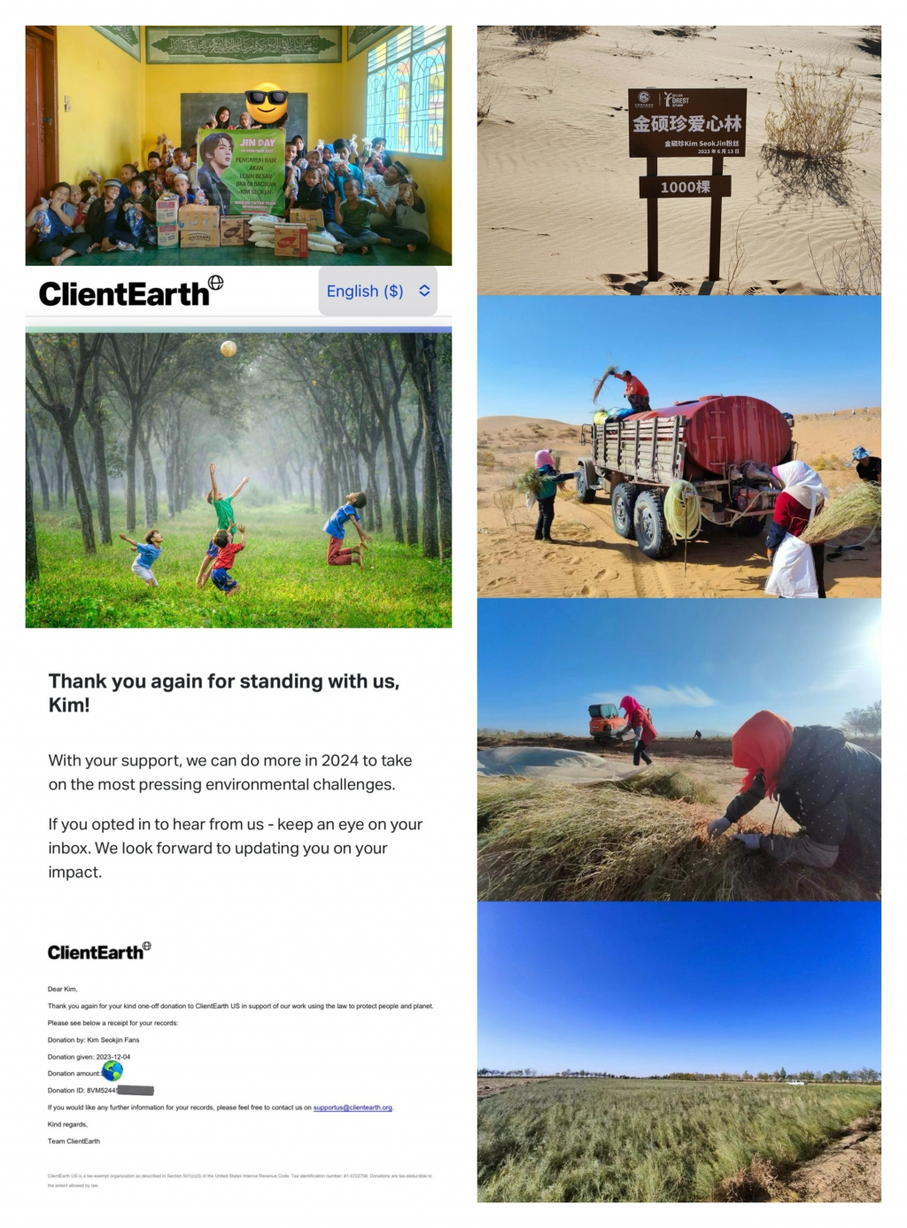 중국에 '김석진 공공 도서관'을 건립한 바 있는 진의 중국 대형 팬 베이스(@ArmyJin_J1)는 'n월의 석진-4월 편' 영상을 통해 진이 제안한 "능력만 있으면 누구나 나무를 심을 수 있기를 바란다"는 말에 영향을 받아 중국 최초의 산림 프로젝트인 Desert Edge Forest-Jin Forest 나무 심기 프로그램을 시작했다. 중국 환경재단에 나무 1000그루의 기금을 기부해 내몽골지역에 나무를 성공적으로 심고 진의 생일에 맞춰 좌표와 중간 과정을 공개했다.