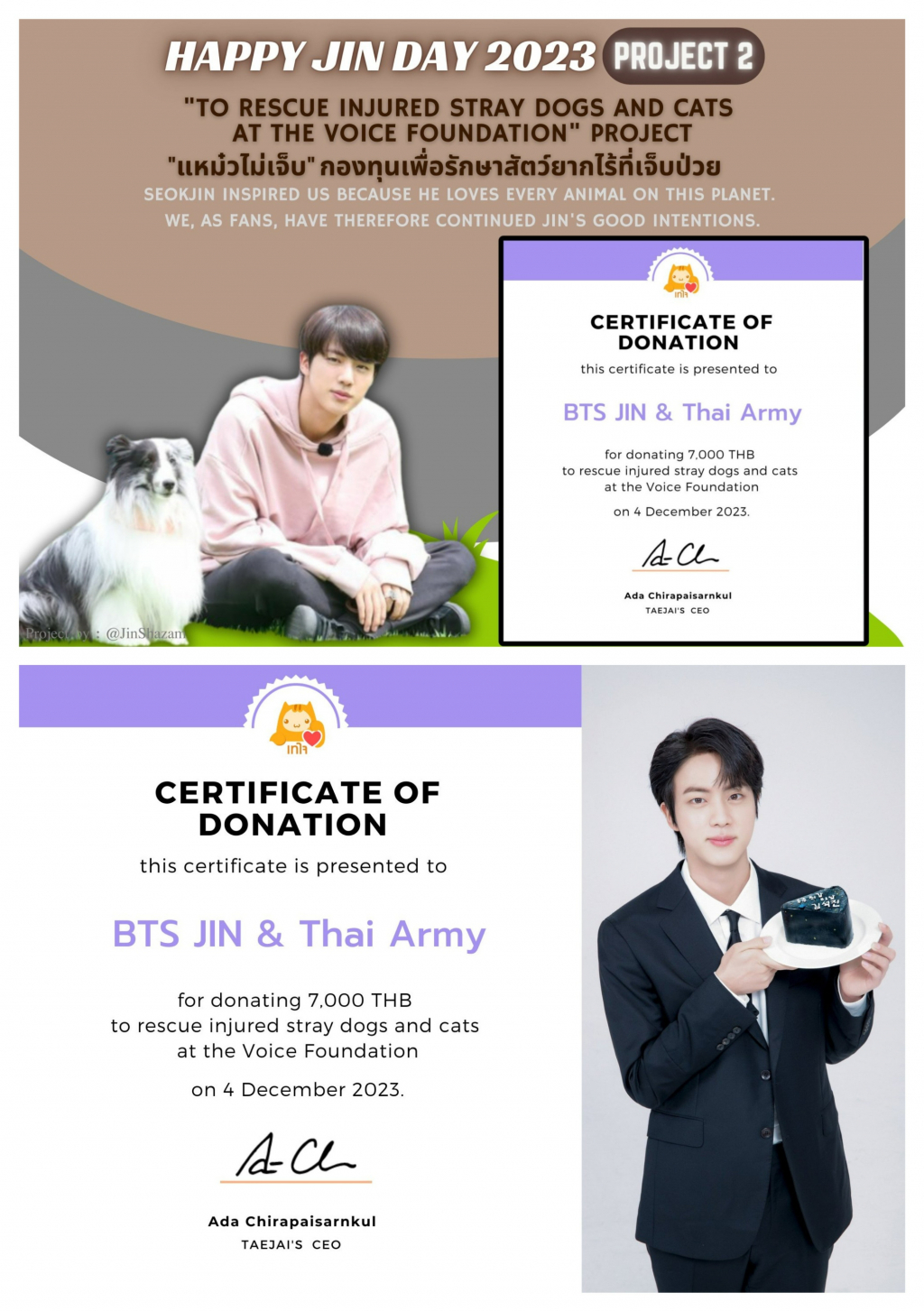 진의 태국 팬 베이스 진 샤잠(@JinShazam)팀에서는 태국 VOICE 재단의 '다친 유기견 유기묘 구조 프로젝트'에 기부금을 보내 부상을 당했거나 질병을 겪고 있는 유기견 유기묘의 치료에 소요되는 의료비를 지원했다.
