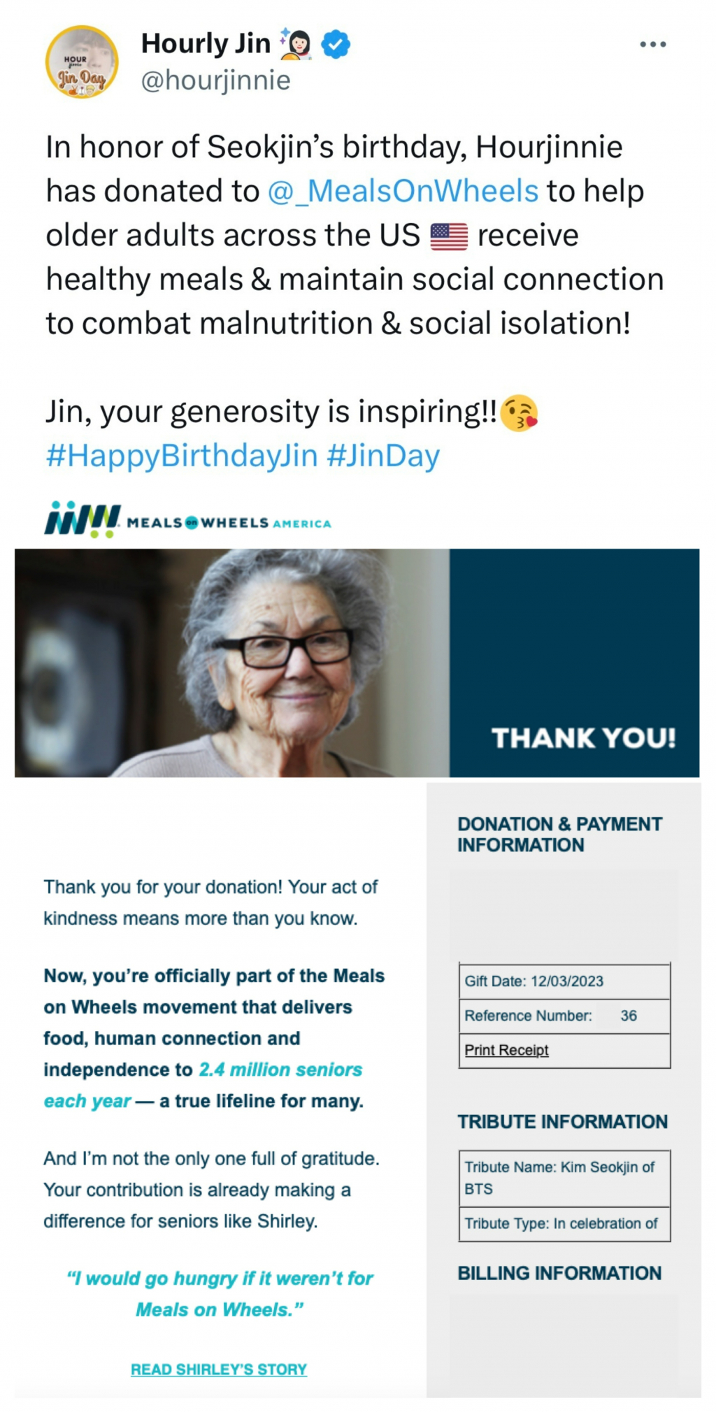 진의 대형 미국 팬 베이스 Hourly Jin(@hourjinnie)은 미 전역에 산재한 외로운 노인들을 찾아 뵙고 영양가 있는 식사를 제공해서 독거 노인들의 사회적 고립과 영양 결핍 해소에 앞장서고 있는 비영리단체 Meals On Wheels에 김석진의 이름으로 기부했다. Meals On Wheels는 미국 내 심각한 외로운 노인 문제들에 대해 미 전국구 불우노인 돕기 비영리 프로그램으로 특별한 의미를 더했다.