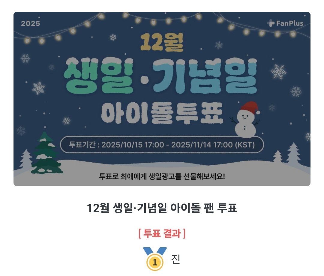 팬앤스타 11월 4주차 솔로 투표 석진이 1위💖 (10주 연속 1위)