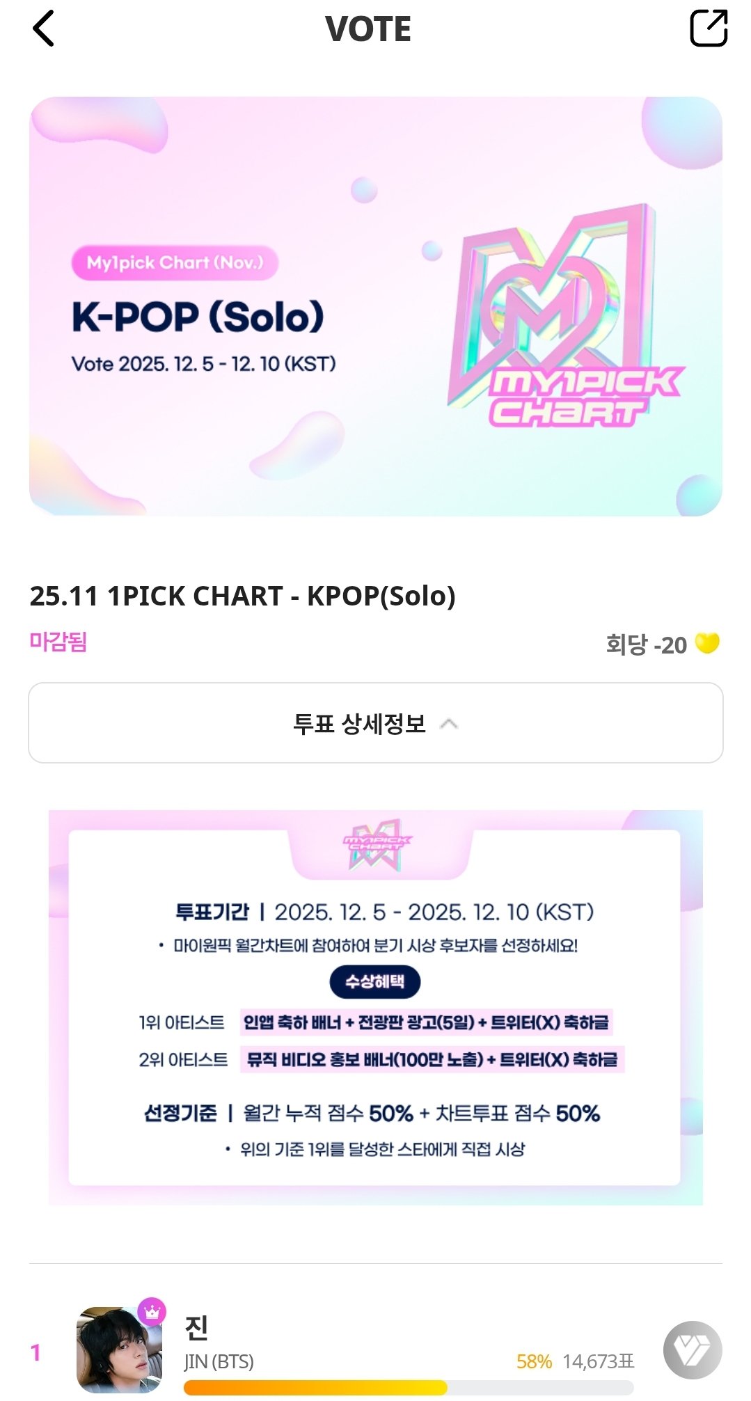 스퀘어 25.11 1PICK CHART - KPOP(Solo) 석진이 1위🏆