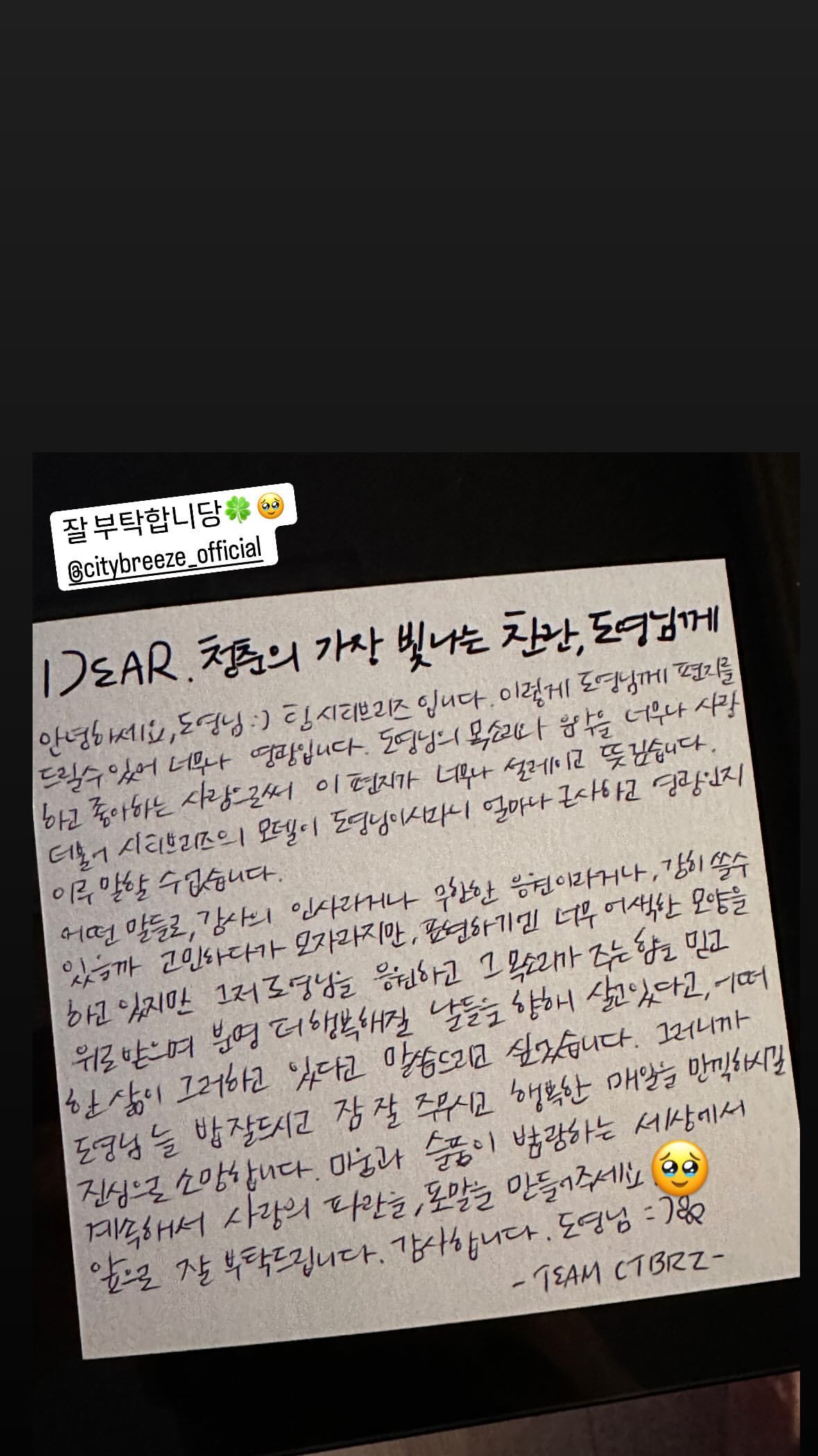 | - | 도토리 | @do0_nct 인스타그램 스토리 └ 📷 잘 부탁합니당🍀🥹 @citybreeze_official └ @citybreeze_official |