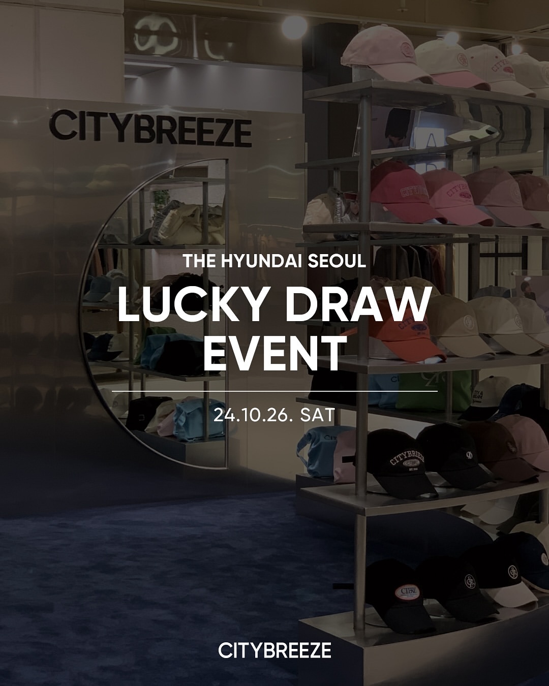 10월 26일 단 하루, 시티브리즈 더현대 서울점에서 럭키드로우 이벤트를 진행합니다. • 참여 방법 - 현장에서 매장 방문 인증샷을 인스타그램 스토리(브랜드 태그) 업로드 시 현장 럭키드로우 기회 부여 * 럭키드로우는 한정수량으로 조기 종료될 수 있습니다. • 럭키드로우 상품 - 시티브리즈xNCT 도영 싸인 폴라로이드 1장 - 시티 스내피 키링 5개 - 시티 스내피 맨투맨 2장 - 메리노울 심볼 로고 풀오버 니트 4장 📍10/26(토) 서울 영등포구 여의대로 108 더현대 서울 B2층 시티브리즈 └ 인스타