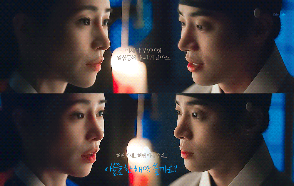 - 정식으로 혼례를 한 사이도 아니고 어쩔 수 없이 부부 행세를 하자는 것인데, 어찌 한 이불을 덮자는지 참 능구렁이가 따로 없으십니다.