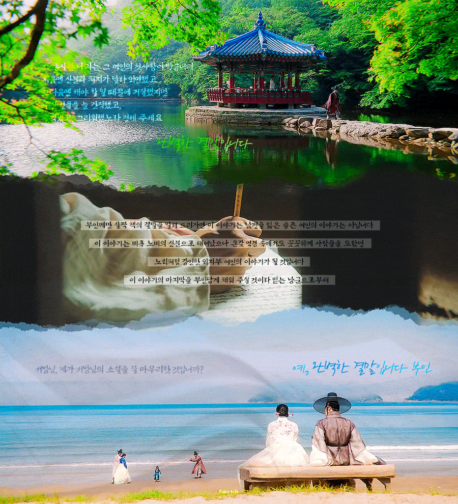 나는 이제 내 마지막 책을 쓰려합니다. 부인께만 살짝 책의 결말을 알려드리자면, 이 이야기는 남편을 잃은 슬픈 여인의 이야기는 아닙니다. 이 이야기는 비록 노비의 신분으로 태어났으나 온갖 역경 속에서도 꿋꿋하게 사람들을 도왔던, 노회처럼 강인한 외지부 여인의 이야기가 될 것입니다.