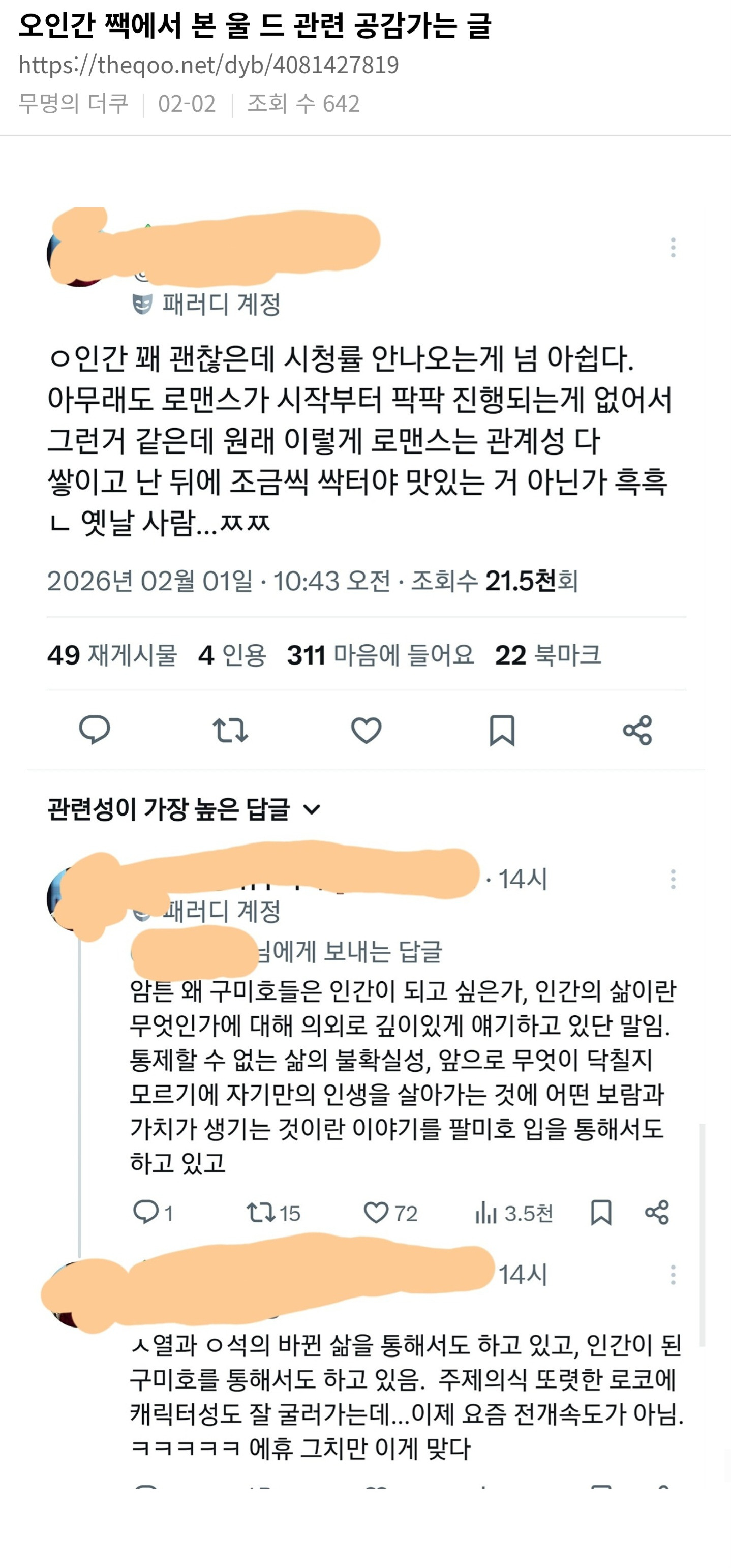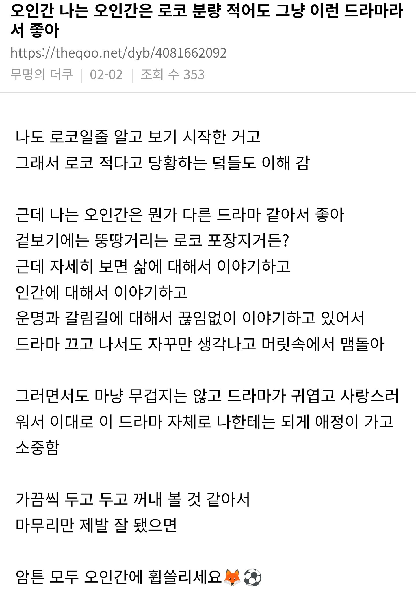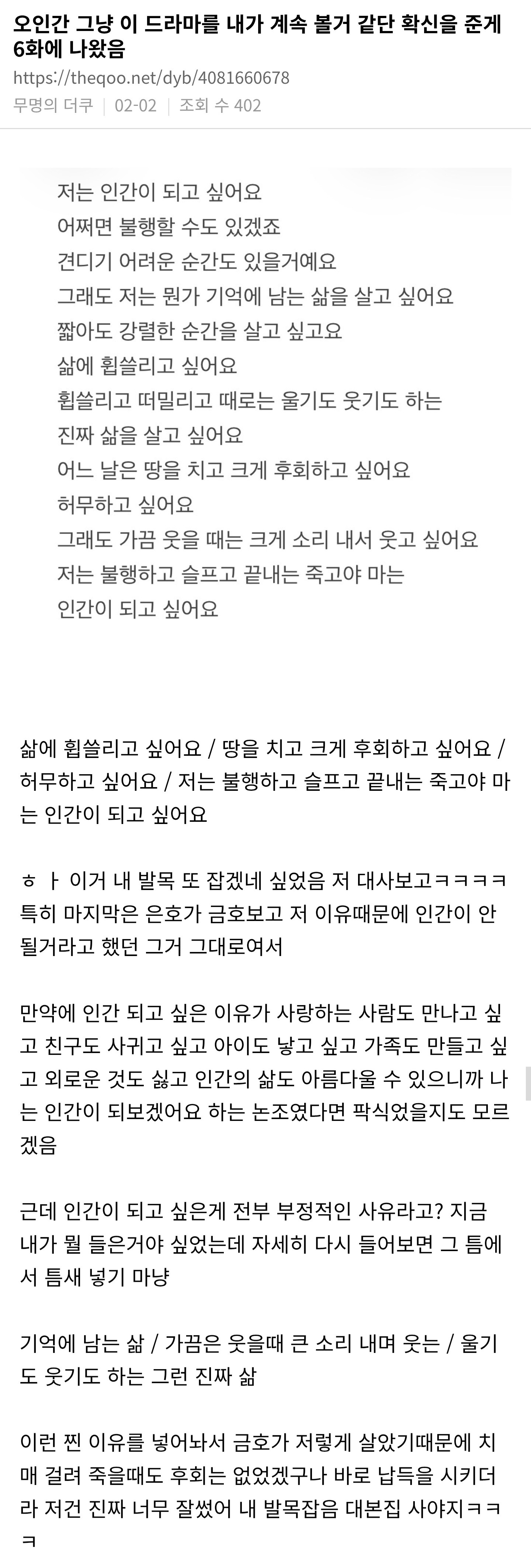 잡담 오인간 밤티 로코인 줄 알았는데 생각보다 인간에 대해 깊생하게 만드는 드라마