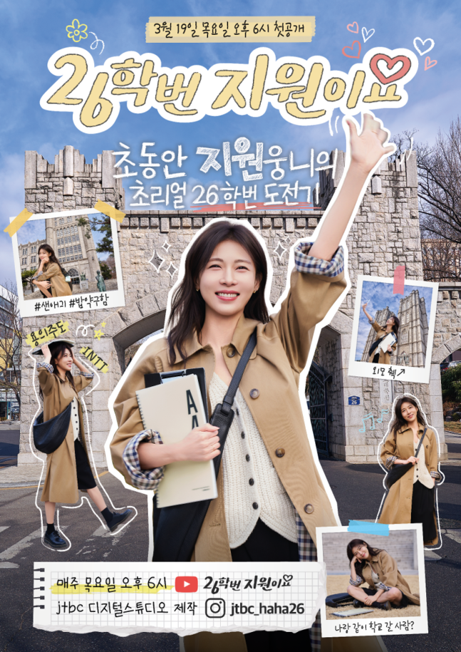 배우 하지원의 26학번 신입생 도전기, JTBC 디지털스튜디오 ‘26학번 지원이요’는 19일 저녁 6시 동명의 유튜브 채널에서 공개될 예정이다.