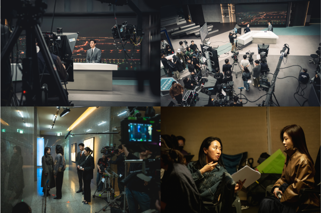 먼저 뉴스 스튜디오 세트에서 촬영을 준비 중인 주지훈의 모습이 포착돼 시선을 사로잡는다. 카메라와 조명 장비가 빼곡히 자리한 가운데 진행된 촬영 현장은 실제 방송 스튜디오를 방불케 한다.