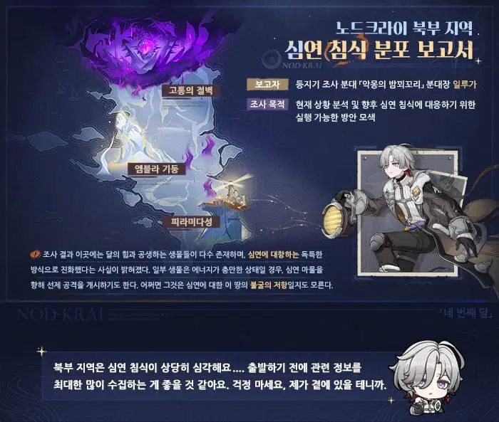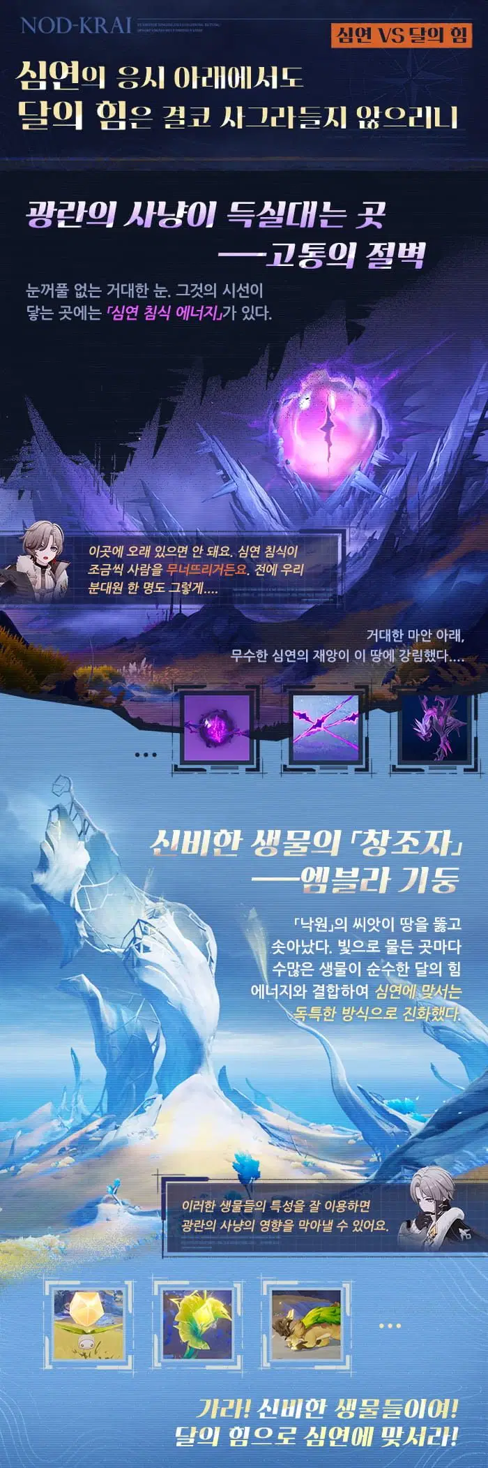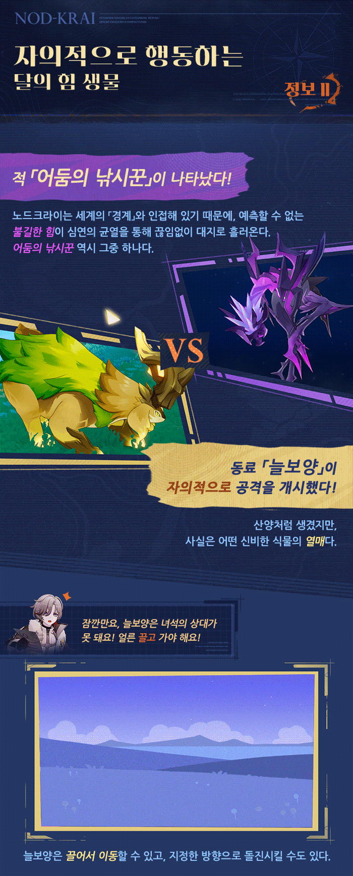 노드크라이 북부, 광란의 사냥과의 전투가 가장 격렬한 곳. 또한 신의 기둥이 발하는 빛이 대지의 의지를 깨운 곳이자, 산천의 초목조차 병사로 화해 싸움에 몸을 던지는 곳. 이는 필경 고향을 지키고자 하는 그들의 의지일 것입니다.