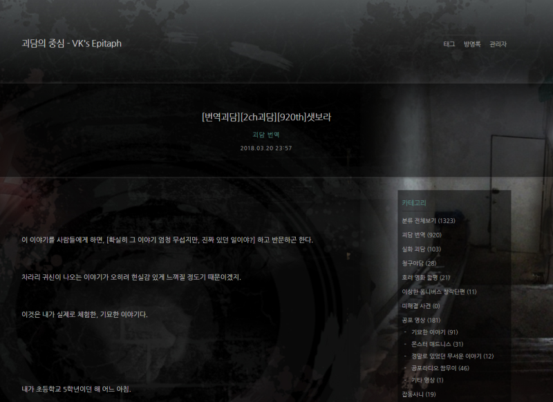 제목 그대로 괴담이 가득한 블로그야. 번역 괴담이나 실화괴담 등 여러 글들이 있으며 공포 영상도 다루는 곳.