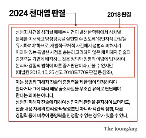 이번에 천 대법관은 “이는 성범죄 피해자 진술의 증명력을 제한없이 인정해야 한다거나 그에 따라 공소사실을 무조건 유죄로 판단해야 한다는 의미는 아니다”(‘천대엽 판결’)며 해석을 제한했다. 천대엽 판결이 파장이 큰 건 성범죄 사건 대부분이 CCTV 영상 같은 객관적인 직접 증거는 부족하고 피해자 진술과 정황 증거만 있기 때문이다.