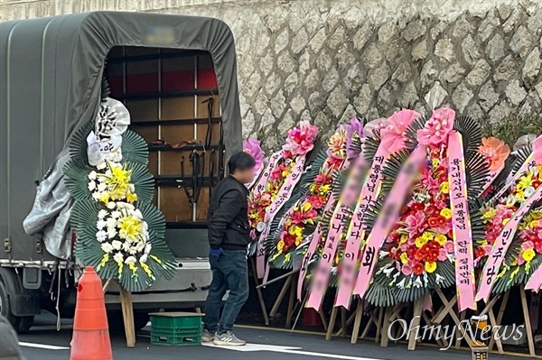 그런데 이날 오후 4시께 근조화환을 실은 트럭이 현장에 도착하자 대통령실 관계자로 보이는 이들이 이를 제지했다. 배달기사는 근조화환을 트럭에서 내린 뒤 구매자에게 인증하기 위한 사진을 찍으려 했지만 이마저도 제지당했다.