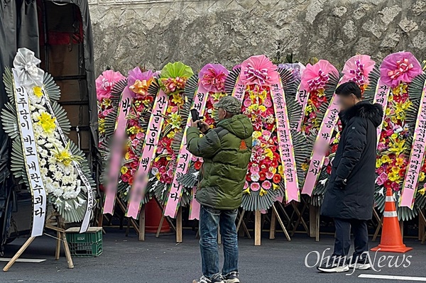 서울 용산 대통령실 앞, 12.3 내란 사태를 일으킨 윤석열 대통령을 찬양하는 화환이 속속 도착하던 중, 이와 반대되는 '근조화환'을 실은 트럭들은 화환을 설치하지 못하고 운전대를 돌렸다. 대통령실 관계자의 제지 때문이었다.