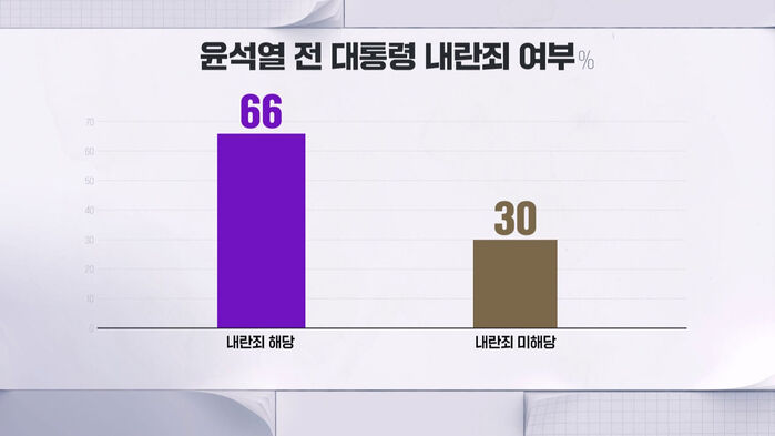 윤석열 전 대통령의 비상계엄 선포 전후 행위가 내란죄에 해당되는지 대해선, '내란죄에 해당한다' 66%, '내란죄에 해당하지 않는다' 30%로, 지난 1월 조사와 비교하면, '내란죄에 해당한다'는 응답은 10%p 늘었고, '해당하지 않는다'는 8%p 줄었습니다.