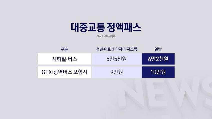 월 5만~6만원으로 버스나 지하철과 같은 대중교통을 월 20만원까지 이용할 수 있는 '대중교통 정액패스'도 새롭게 도입됩니다.