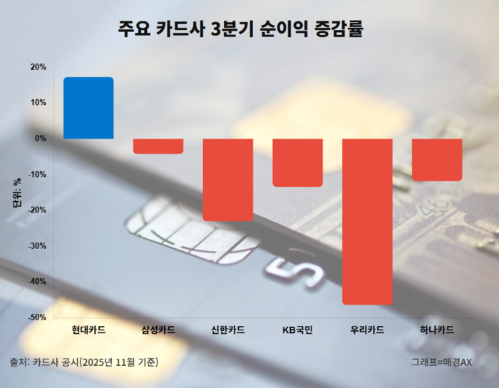 3일 카드업계에 따르면 이날 기준, 3분기 실적을 발표한 국내 전업 카드사 6곳(신한·삼성·KB국민·현대·우리·하나) 중 현대카드를 제외한 모두가 순이익이 역성장했다.