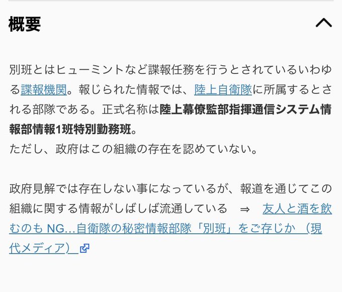 별반이란 휴민트 등 첩보 임무를 수행하는 이른바 첩보기관. 보도되어진 정보로는 육상자위대에 소속되어 있다고 하는 부대이다. 정식 명칭은 육상막료감부 지휘통신체계정 보부 정보 1반 특근반.