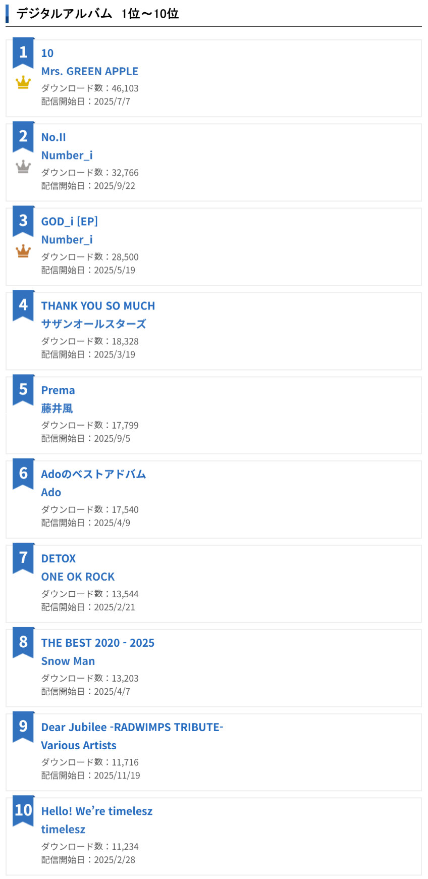 2025년 오리콘 연간 디지털 앨범 랭킹 1위~10위