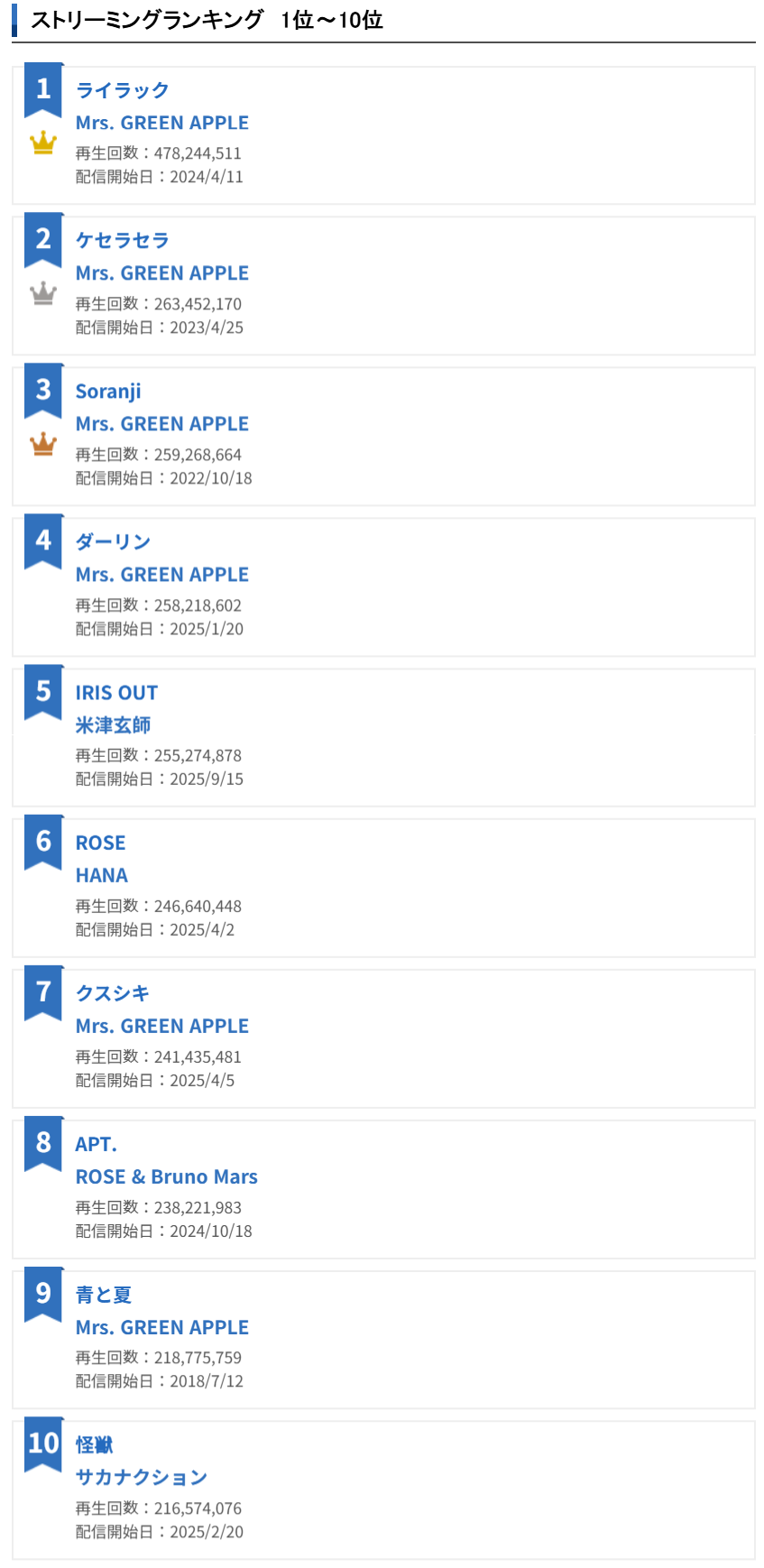 2025년 오리콘 연간 스트리밍 랭킹 1위~10위