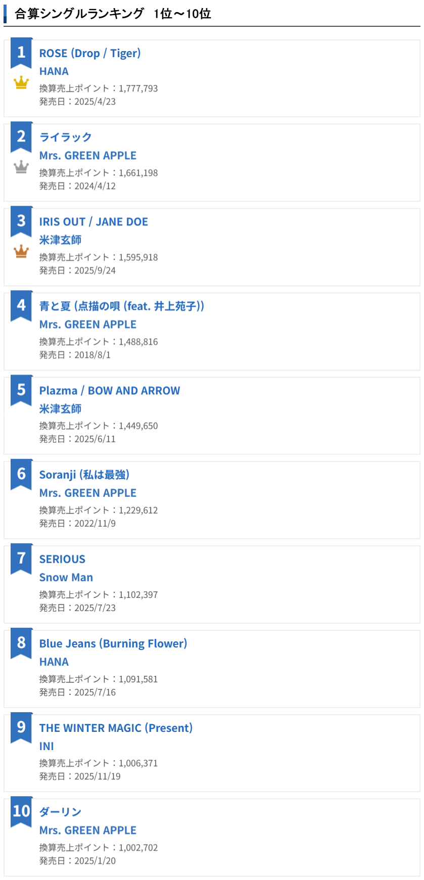 2025년 오리콘 연간 합산 싱글 랭킹 1위~10위