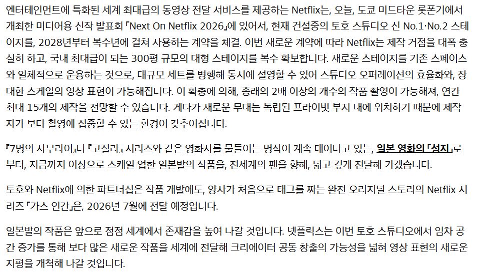 Netflix, 토호 스튜디오의 신 스테이지를 확보 ー 일본발・실사 작품으로 새로운 도전을 한다ー