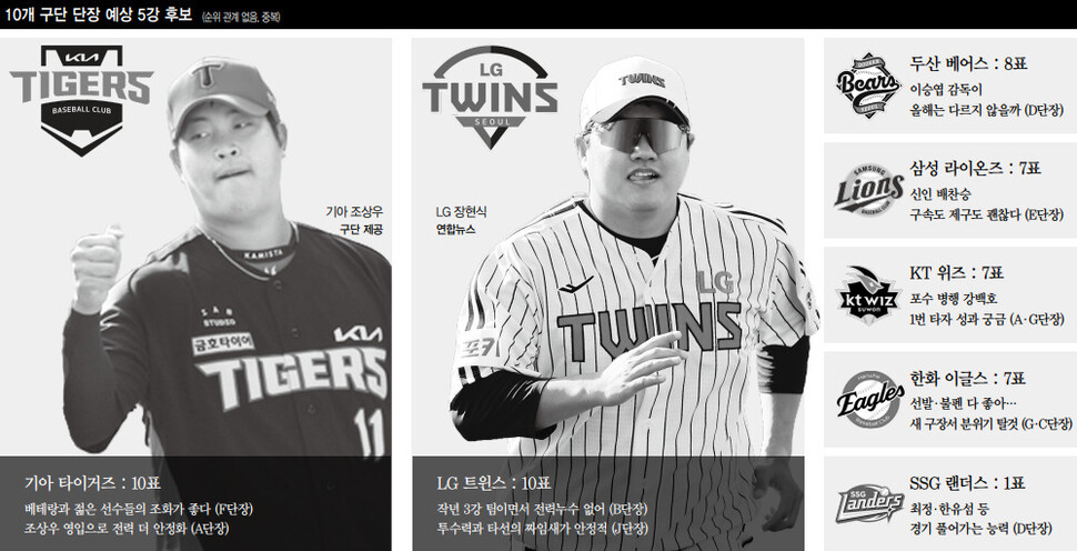 5강 예상 질문에서 ‘디펜딩 챔피언’ 기아(KIA) 타이거즈와 엘지(LG) 트윈스는 모든 구단 단장들의 선택을 받았다. 가장 강력한 우승 후보는 역시나 기아였다. 비수도권 구단 A단장은 “전년도 우승 멤버들이 동일하게 전력을 구축하고 있고, 장현식(FA로 LG 이적)의 빈자리는 트레이드를 통해 영입한 조상우가 메울 수 있을 것 같다. 전년도에 부상으로 이탈한 윤영철, 이의리의 복귀로 팀 전력은 더욱 안정됐다”고 평했다. 수도권 구단 F단장은 “기아는 투타 밸런스가 안정적이고, 베테랑과 젊은 선수들의 조화가 좋다”고 했다. 비수도권 H단장은 “기아는 투수진의 안정감으로 연패 가능성이 가장 적은 팀”이라고 평가했다.