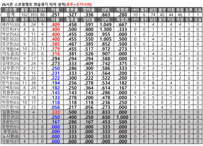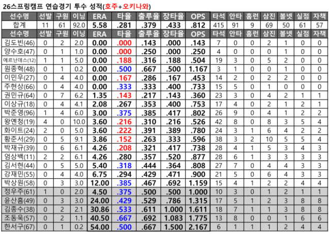 스캠 연습경기 투타 성적