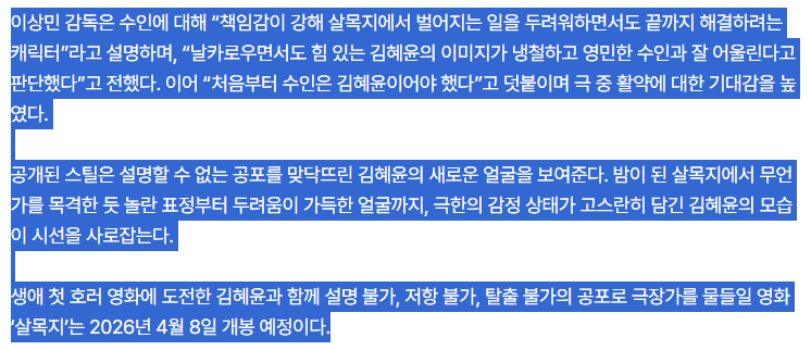 └“책임감이 강해 살목지에서 벌어지는 일을 두려워하면서도 끝까지 해결하려는 캐릭터”라고 설명하며, “날카로우면서도 힘 있는 김혜윤의 이미지가 냉철하고 영민한 수인과 잘 어울린다고 판단했다”고 전했다. 이어 “처음부터 수인은 김혜윤이어야 했다”고 덧붙이며 극 중 활약에 대한 기대감을 높였다.