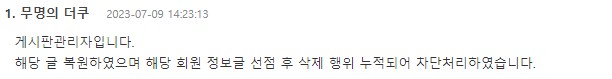 핫게 갈만한 공식 영상 글 지워져서 문의 했더니 복구하고 처리됐대
