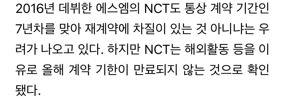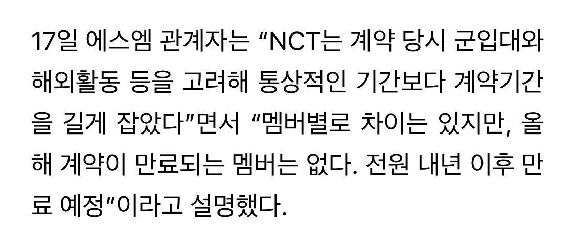 “NCT는 계약 당시 군입대와 해외활동 등을 고려해 통상적인 기간보다 계약기간을 길게 잡았다”면서 “멤버별로 차이는 있지만, 올해 계약이 만료되는 멤버는 없다. 전원 내년 이후 만료 예정”이라고 설명했다.