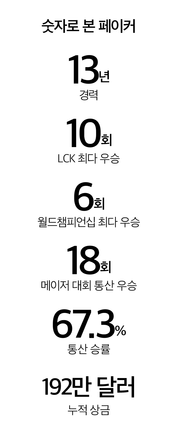 페이커의 커리어는 e스포츠의 성장 과정과 맞닿아 있다. 2013년 데뷔 첫해 국내 리그인 2013 LoL 챔피언스 서머를 제패했고, 같은 해 롤드컵까지 들어 올리며 ‘로열로더’가 됐다. 이후 메이저 국제대회 최다 우승(8회), 최다 결승 진출(13회), LCK 최다 우승(10회), 라이엇게임즈 3대 메이저 대회 통산 우승(18회), 2022 항저우 아시안게임 LoL 부문 금메달, 2024년 e스포츠 월드컵 리그 오브 레전드 부문 우승까지 굵직한 기록을 쌓아왔다. 웬만한 선수라면 하나만으로도 평생의 대표 경력이 될 기록이 그의 커리어에선 한 줄짜리 이력으로 겹겹이 쌓여 있다. 정부가 오는 10월 페이커의 기념우표를 발행할 만큼 그 위상이 남다르다.
