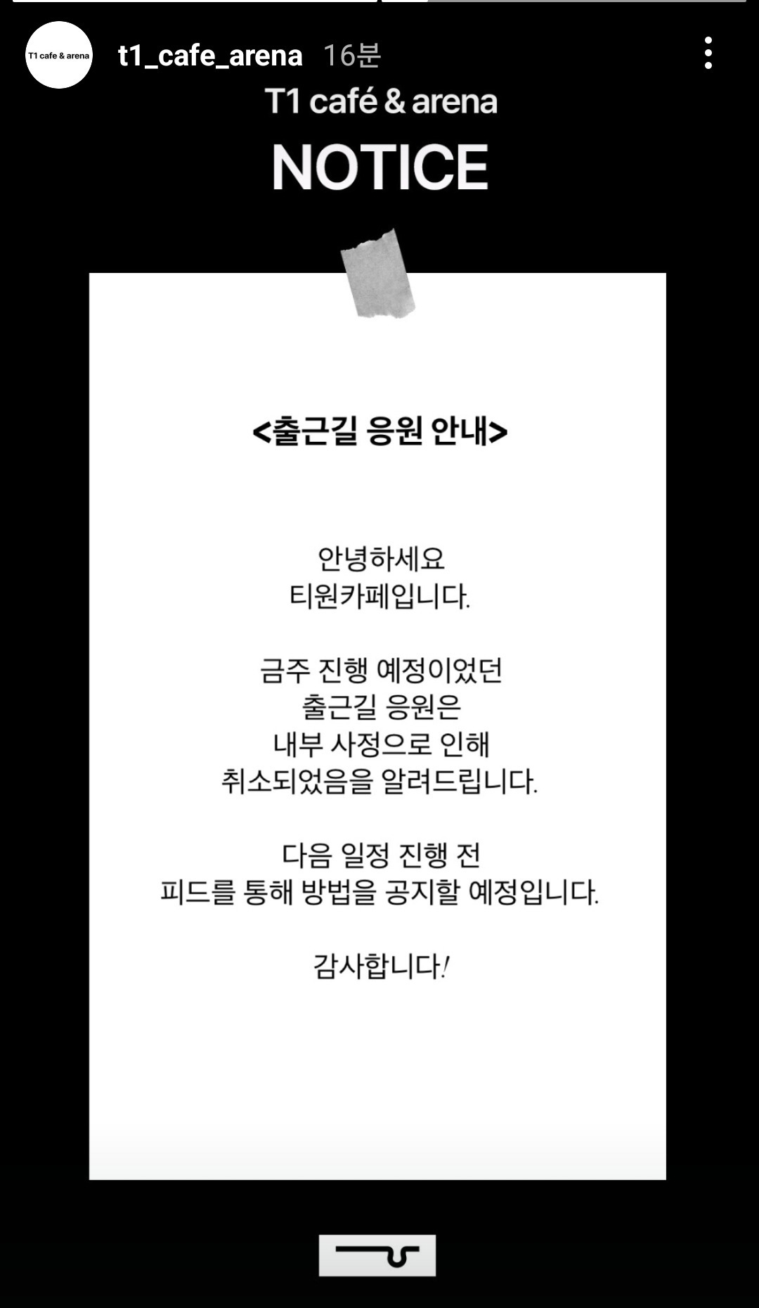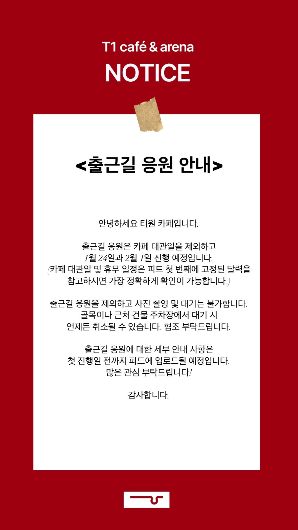 | T1 cafe) 금주 티원 출근길 응원 취소 안내 |