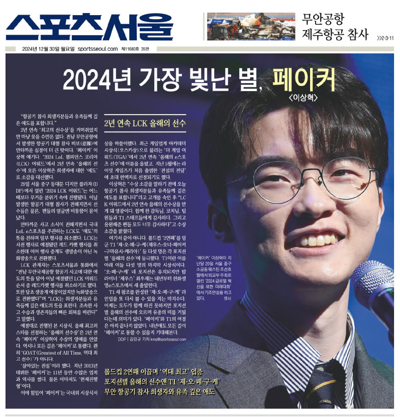 30 월 뉴스/기사 [스포츠서울 지면] 2024 가장 빛난 별, 페이커
