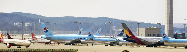 코로나19 여파로 항공사들의 국내·국제선 운항이 대부분 중단된 가운데 지난 2일 인천공항 2터미널에 운항을 하지 못하고 서 있는 여객기들이 즐비하다. [김재훈 기자]