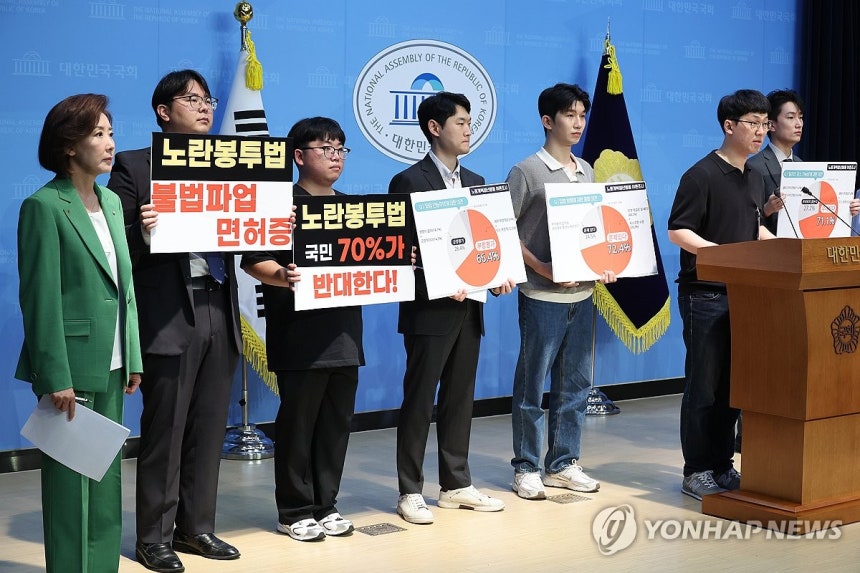 12일 서울 여의도 국회 소통관에서 노동개혁청년행동 관계자들이 노란봉투법 입법 반대 기자회견을 하고 있다.