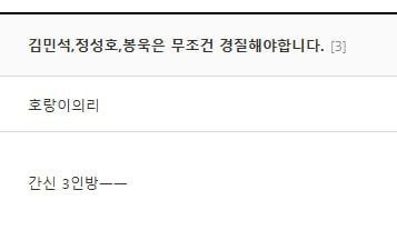 한 사용자는 "김민석·정성호·봉욱을 무조건 경질해야한다"며 "간신 3인방"이라고 표현했다.