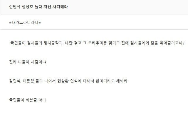 또 다른 사용자는 "김 총리와 정 장관은 자진 사퇴하라"면서 "내란 겪고 트라우마 잊기도 전에 검사들에게 칼을 쥐어주려고 한다"고 지적했다.