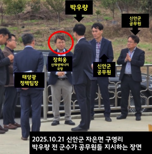 뉴탐사가 입수한 사진에는 박우량이 군수직 상실 후에도 신안군 공무원들을 앞에 세워놓고 현직 군수처럼 지시하는 모습이 담겨 있다. 촬영 시점은 2025년 10월 21일로, 8·15 특사로 사면된 뒤 정청래 대표 특보로 임명되기도 전이다. 특보 직함이 있다고 해서 신안군 공무원을 지휘할 권한이 생기는 것도 아니다. 햇빛연금을 설계했던 장희웅 등 공무원들이 박우량 앞에 도열해 있었다.