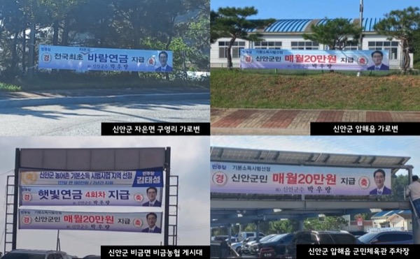 정청래 당대표 특보인 박우량 전 신안군수의 행태는 목불인견이다. 박우량은 2025년 3월 대법원 판결로 군수직을 상실했다. 그런데 신안군 곳곳에는 "기본소득 시범사업 선정, 매월 20만 원"이라는 박우량의 현수막이 걸려 있다. 자은면 구영리 마을 가로변, 압해읍, 비금면 비금농협 게시대 등 여러 곳에서 확인됐다. 마치 자신의 공인 것처럼 선거운동을 하고 있다.