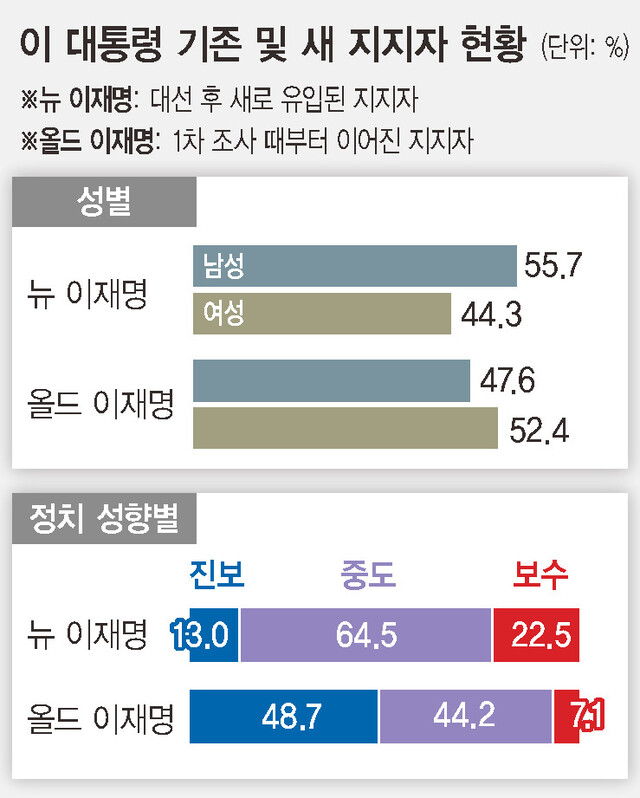 이번 조사에서 이 대통령의 국정운영을 지지한 유권자 가운데 23.1%는 대통령 선거 전인 1차 패널조사(5월8~11일) 때는 이 대통령을 지지하지 않았던 응답자다. 현재 이 대통령 국정운영을 지지하는 4명 가운데 1명은 대선 뒤 새로 유입된 ‘뉴 이재명’ 유권자라는 얘기다. ‘뉴 이재명’이 전체 유권자 가운데 차지하는 비율은 14.5%였다. 1차 조사 때와 변함없이 이 대통령을 지지한 ‘올드 이재명’은 현재 이 대통령 지지층의 76.8%, 전체 유권자의 48.2%였다. 취임 뒤 복지 사각지대를 해소하겠다는 의지를 드러내고, 외교 분야에서 국익 중심 실용노선을 견지한 것 등이 좋은 평가를 받은 데 따른 것이란 분석이 나온다.