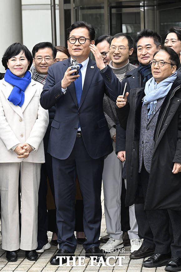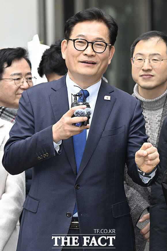 지난 2021년 더불어민주당 전당대회 관련 '돈봉투 살포' 의혹 등으로 재판을 받아온 송영길 소나무당 대표가 13일 오후 서울 서초구 서울고등법원에서 열린 항소심 선고공판에서 무죄를 선고받은 후 입장을 밝히고 있다.