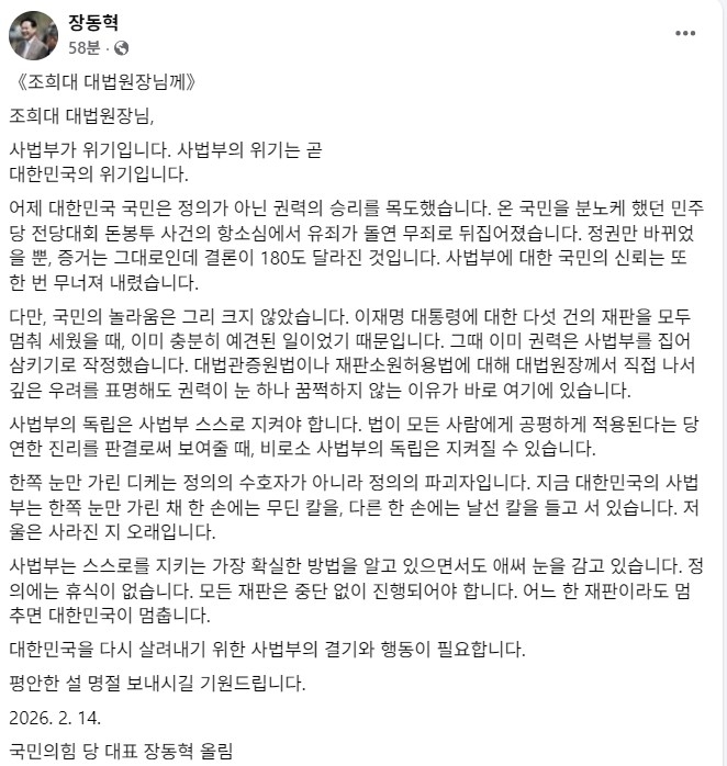 장동혁 국민의힘 대표가 14일 조희대 대법원장에게 중단된 이재명 대통령 재판 재개를 촉구했다.