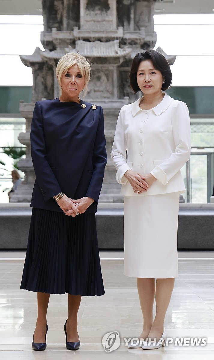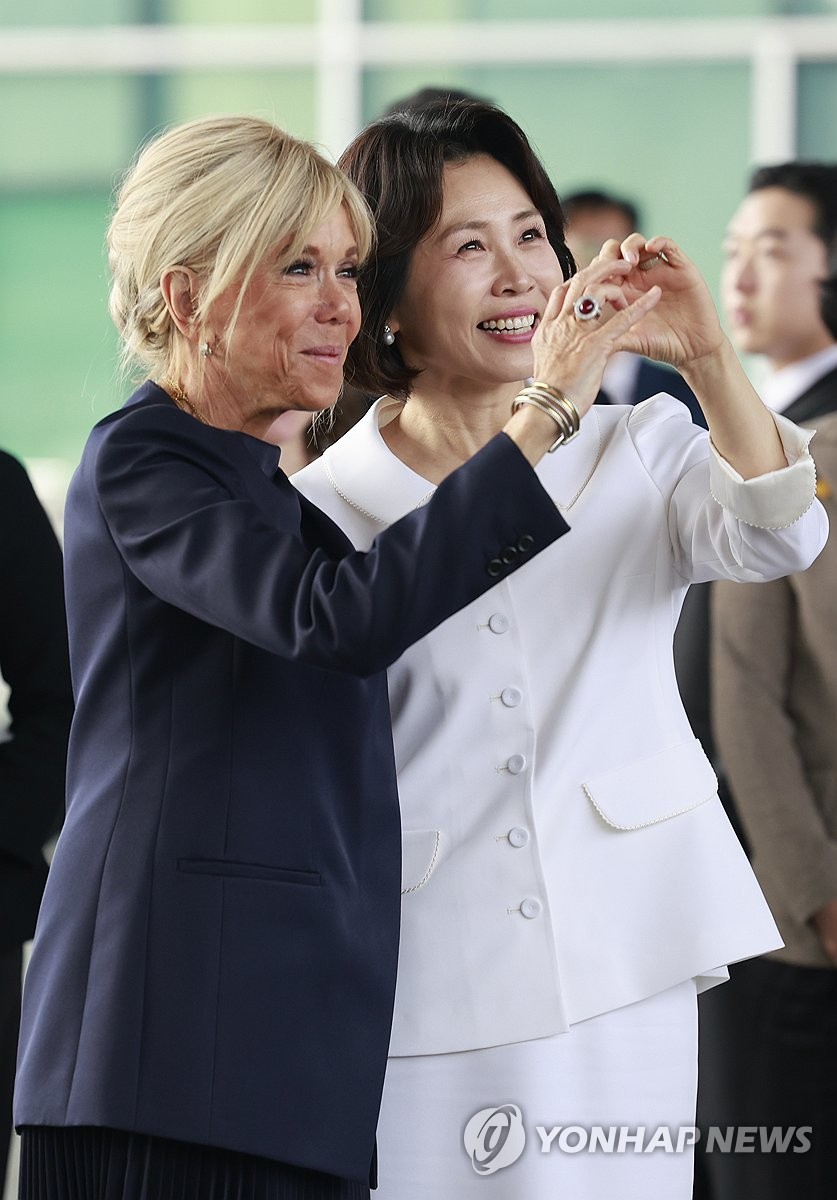 (서울=연합뉴스) 한상균 기자 = 김혜경 여사와 에마뉘엘 마크롱 프랑스 대통령의 부인 브리지트 마크롱 여사가 3일 서울 용산구 국립중앙박물관에서 관람객들을 향해 손하트를 하고 있다.