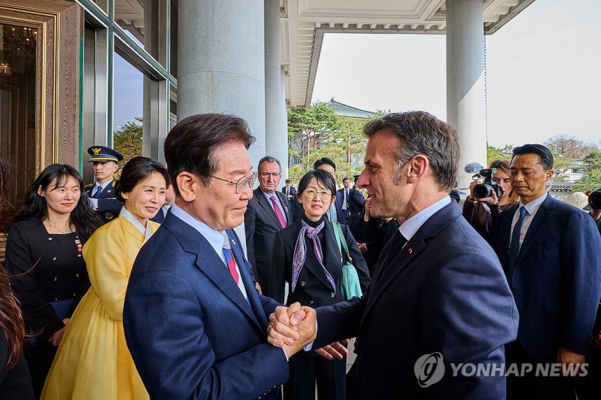 (서울=연합뉴스) 이재명 대통령과 에마뉘엘 마크롱 프랑스 대통령이 3일 청와대 영빈관에서 국빈 방한 환영 오찬을 마친 뒤 인사를 나누고 있다. 2026.4.3