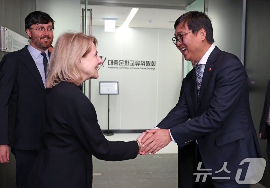 (서울=뉴스1) = 최휘영 문화체육관광부 장관이 3일 서울 종로구 대중문화교류위원회에서 열린 '한-프랑스 수교 140주년 문화장관 면담'에서 기념촬영을 하고 있다.