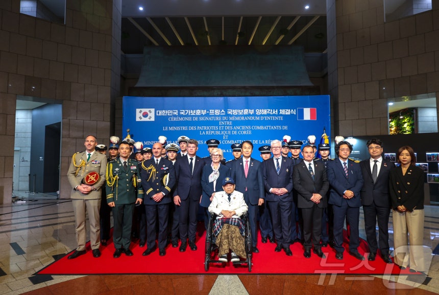 (서울=뉴스1) = 권오을 국가보훈부 장관이 2일 오후 서울시 용산구 전쟁기념관에서 열린 대한민국 국가보훈부-프랑스 국방보훈부 양해각서 체결식에 참석해 카트린 보트랭 프랑스 국방보훈부 장관를 비롯한 참석자들과 함께 기념촬영을 하고 있다.