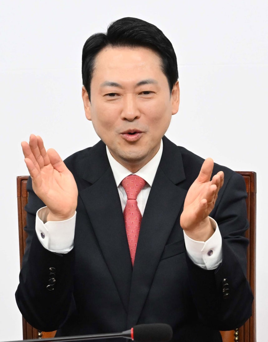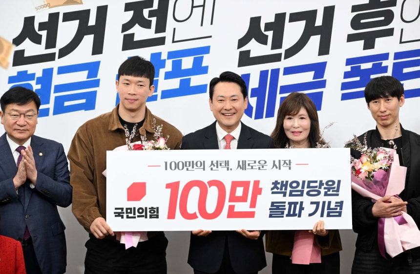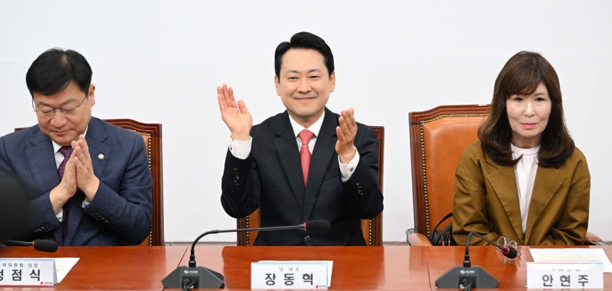 장동혁 국민의힘 대표와 송언석 원내대표가 9일 서울 여의도 국회에서 열린 국민의힘 100만 책임당원 돌파 기념식에 참석해 박수치고 있다.