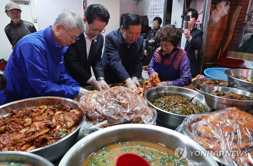 (여수=연합뉴스) 이동해 기자 = 더불어민주당 정청래 대표와 민형배, 김영록 전남광주통합특별시장 후보가 9일 전남 여수시 서시장을 방문해 김치를 버무리고 있다.
